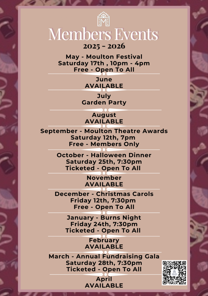Moulton Theatre, a beloved venue nestled in the heart of the community, is dedicated to fostering a sense of togetherness and promoting the arts through its monthly events. These gatherings are meticulously organised by our passionate members, who strive to create a vibrant atmosphere for both theatre aficionados and the local community.